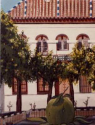 Acryl auf Leinwand 30 cm x 50 cm Wer Sevilla kennt, weiss um diesen romatischen Plaza in der Altstadt. Orangenbäume überall. Zu der Zeit waren die Orangen noch grün. Normalerweise hat fast jeder Plaza eine kleine oder grössere Fontäne oder einen Brunnen. Ich habe diesen durch eine grüne Orange ausgetauscht.Merkmale